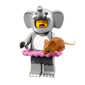 LEGO 71021 Series 18 Collectible Minifigures Elephant Costume Girl with a mouse. Each collectible minifigure is brand new factory sealed in its original mint condition foil pack complete with accessories, display plate, and collector's leaflet.