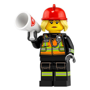 LEGO 71025 Series 19 from 2019 Collectible Minifigure Fire Fighter with a megaphone. Each collectible minifigure is brand new factory sealed in its original mint condition foil pack complete with accessories, display plate, and collector's leaflet.